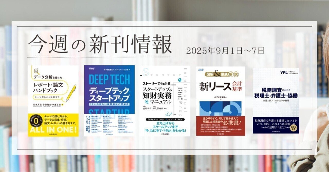 2025年9月1日~7日の中央経済社新刊情報をお届けします! 各書影をクリックすると「ビジネス専門書Online」(中央経済社ECサイト)にて詳細をご覧いただけます。なお、発売日の3日前から予約受付開始となります。 「今週の新刊情報」は原則...
